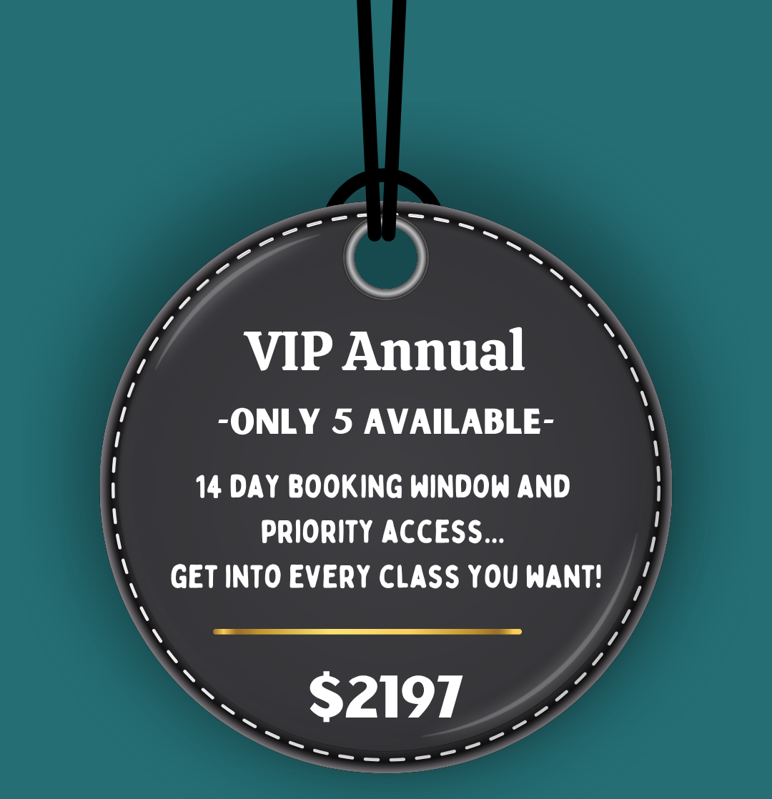 If you're the type of person that wants the classes that you want when you want them, the VIP Annual is for you! In addition to getting a 2-week booking window (only 5 of you will have this advanced booking... for real!), you'll also get priority waitlist access. This means that if you do happen to find yourself on a waitlist (let's say you didn't sign up ahead of time), just call, text, or email the studio within 24 hours of the class you want to take and we'll bump you in. In addition, we're psyched to also include the following perks: