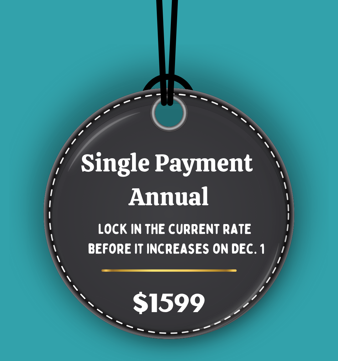 Our Single Payment Annual is truly the best bang for your buck when what you want is unlimited classes. AND this is one heck of a deal which will be no longer come December 1st. That's right, our Annual is increasing, and we want you to have the chance to lock in this great rate for the next year.